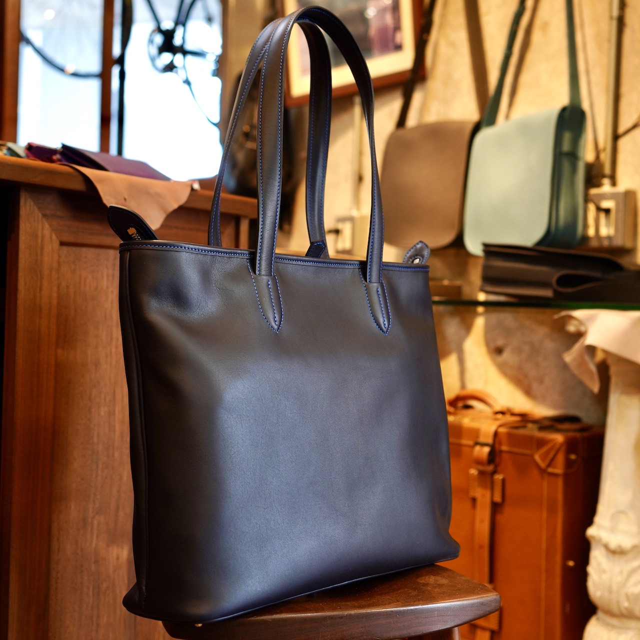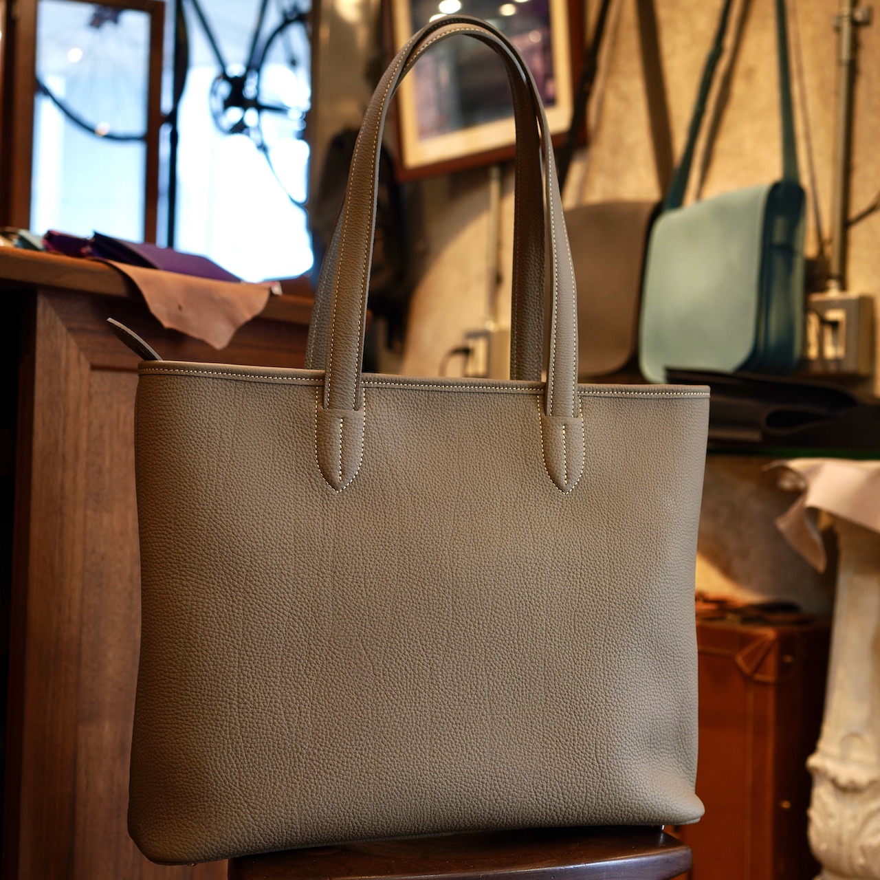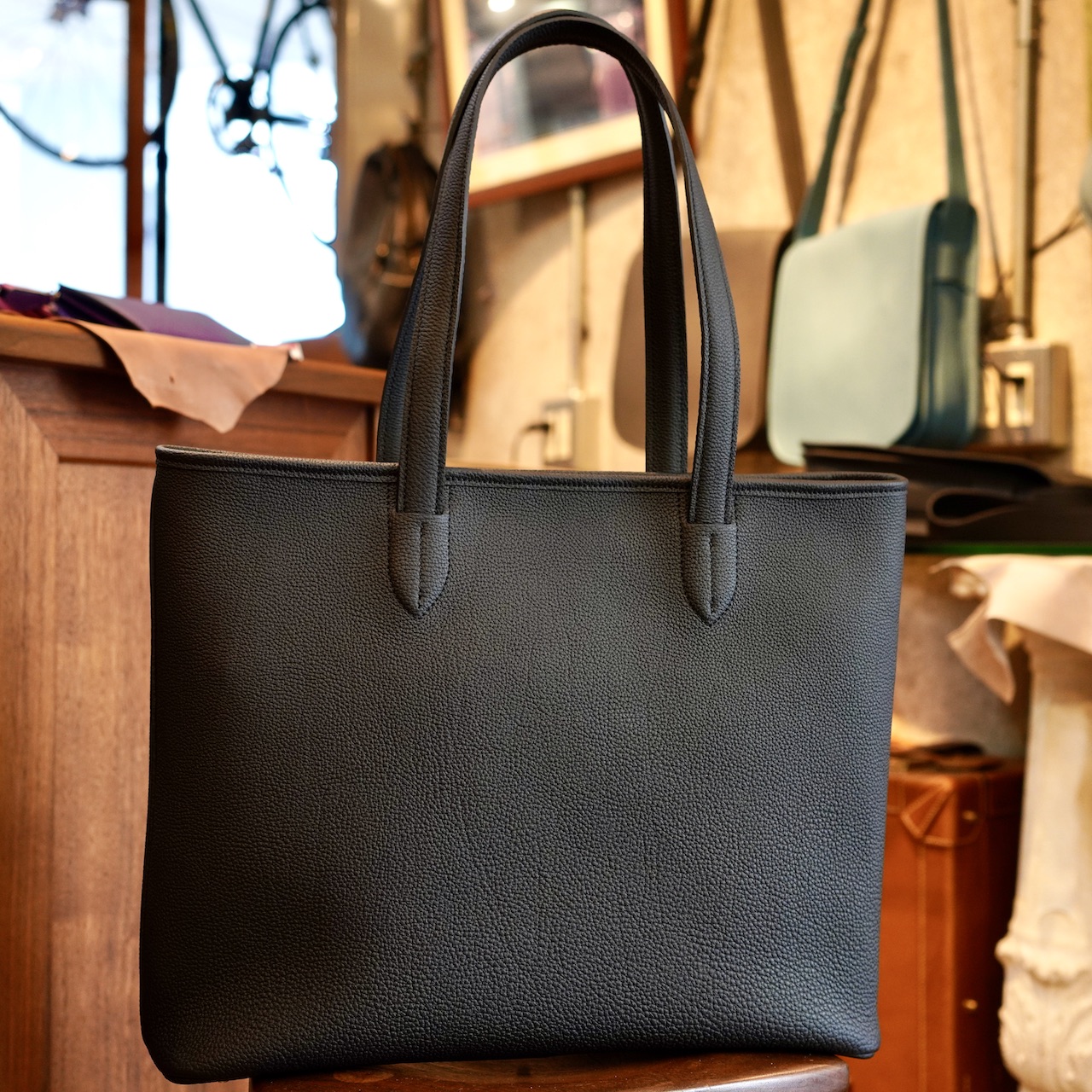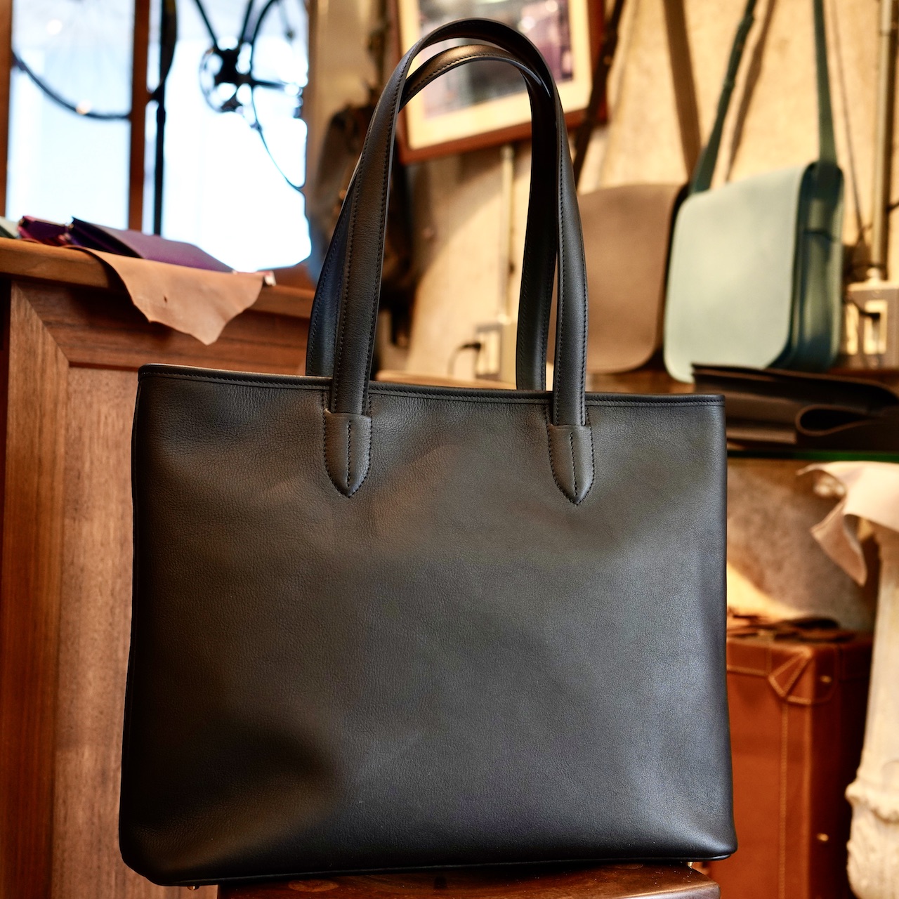 男性でも女性でもさりげなく持てるビジネス用レザートートバッグを想定し生まれた「フェルミートート」が店頭に並びました。A4ファイルが横幅で収納できるサイズで、通勤電車に腰掛けた時に自分の体幅に収まるようになるように何度も試作繰り返しました。これは最大卸先のCIRCLEの青山さんの提案でした。その結果ル・ボナーらしい正方形に近い縦横比で個性的〜