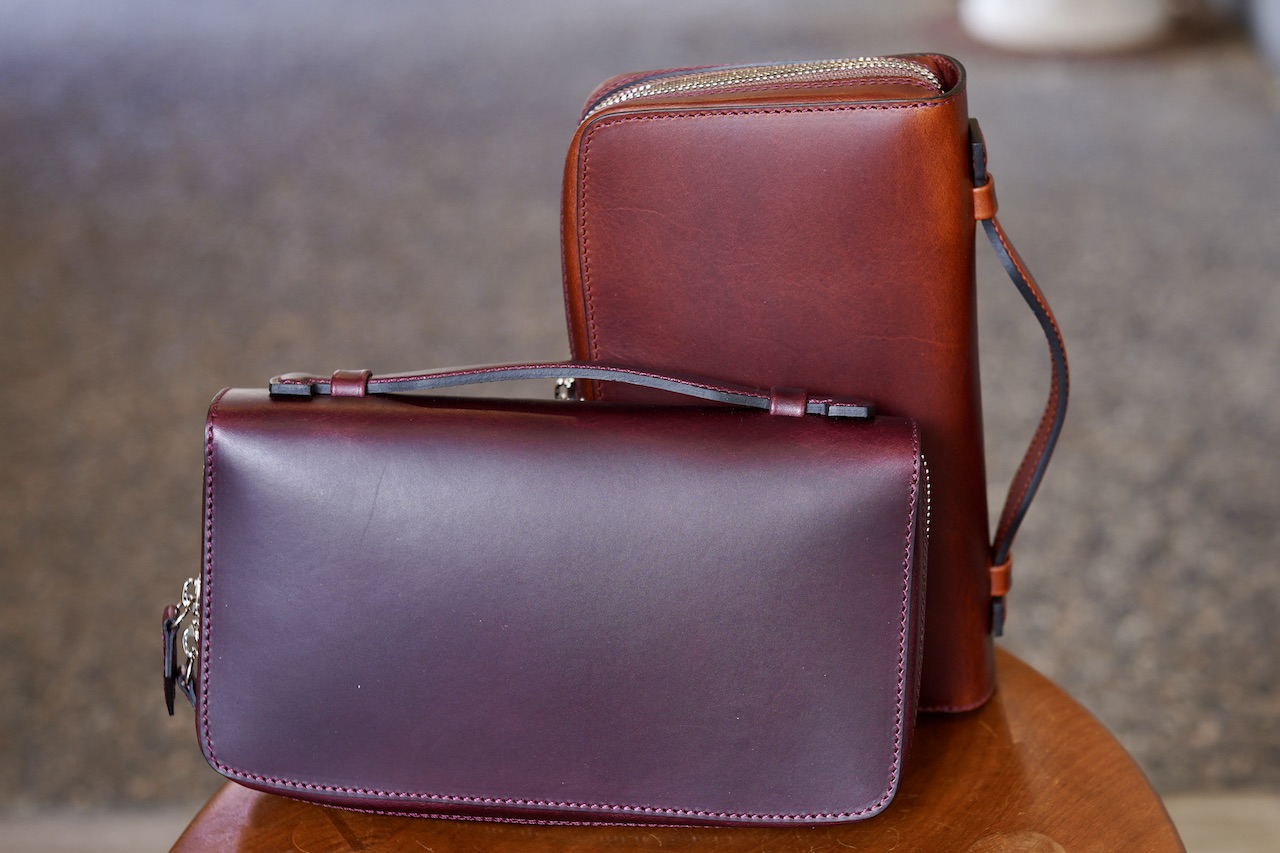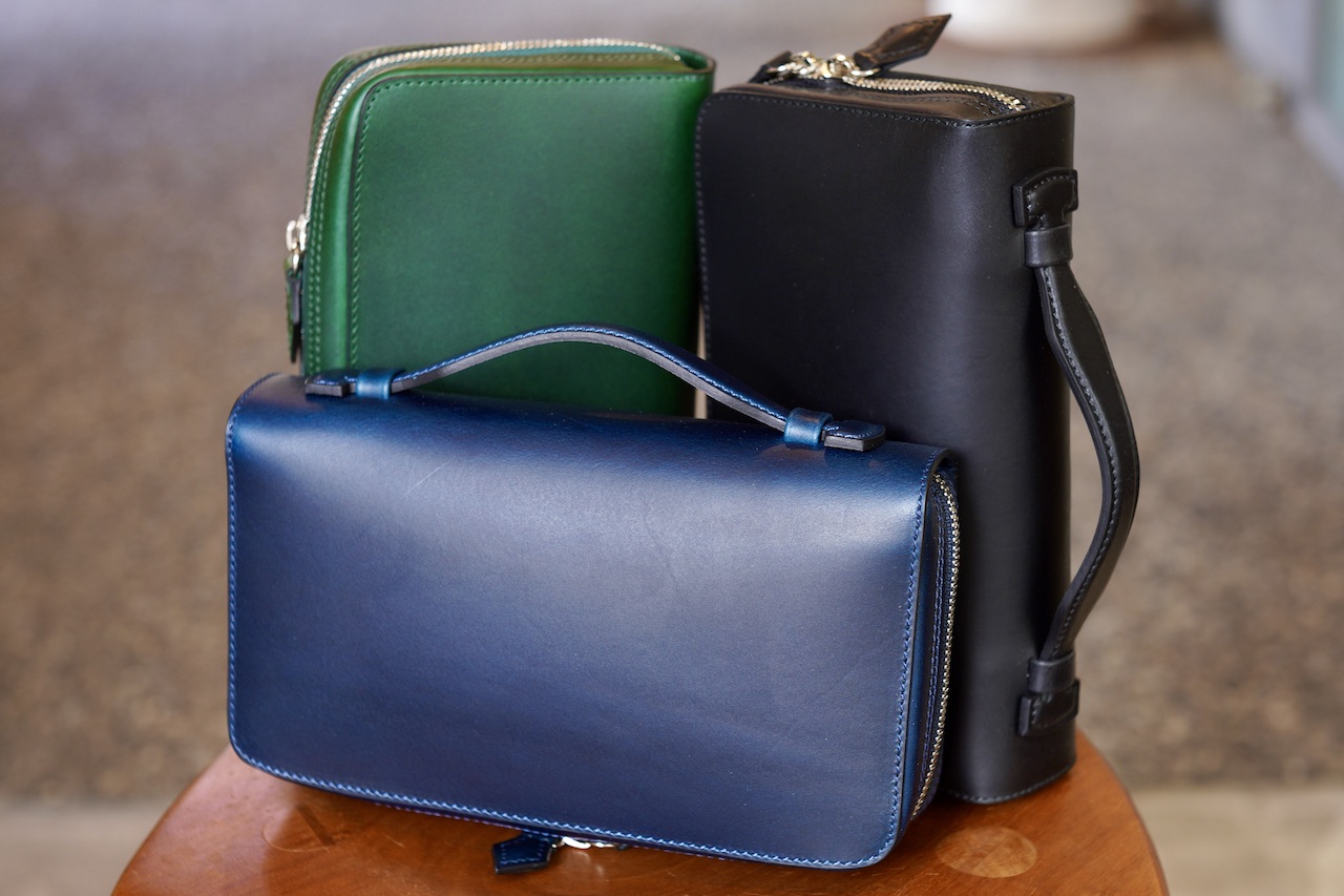「ポーチ・ピッコロ」店頭に並びました。今回は今まで作った事のない革でも作りました。ル・ボナー最大卸先様のCIRCLEさんのご要望にお応えして、イタリアのワルピエ社のブッテーロよりオイリーなマレンマでも作りました。この革は仕入元の革屋さんが黒、チョコ、茶(油分入れ過ぎて赤茶)以外はストックしないそうで、グリーン、ワイン、ブルーは今後日本国内で作る製品では見なくなるでしょうね。