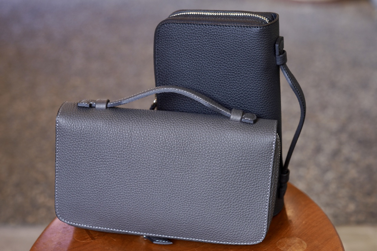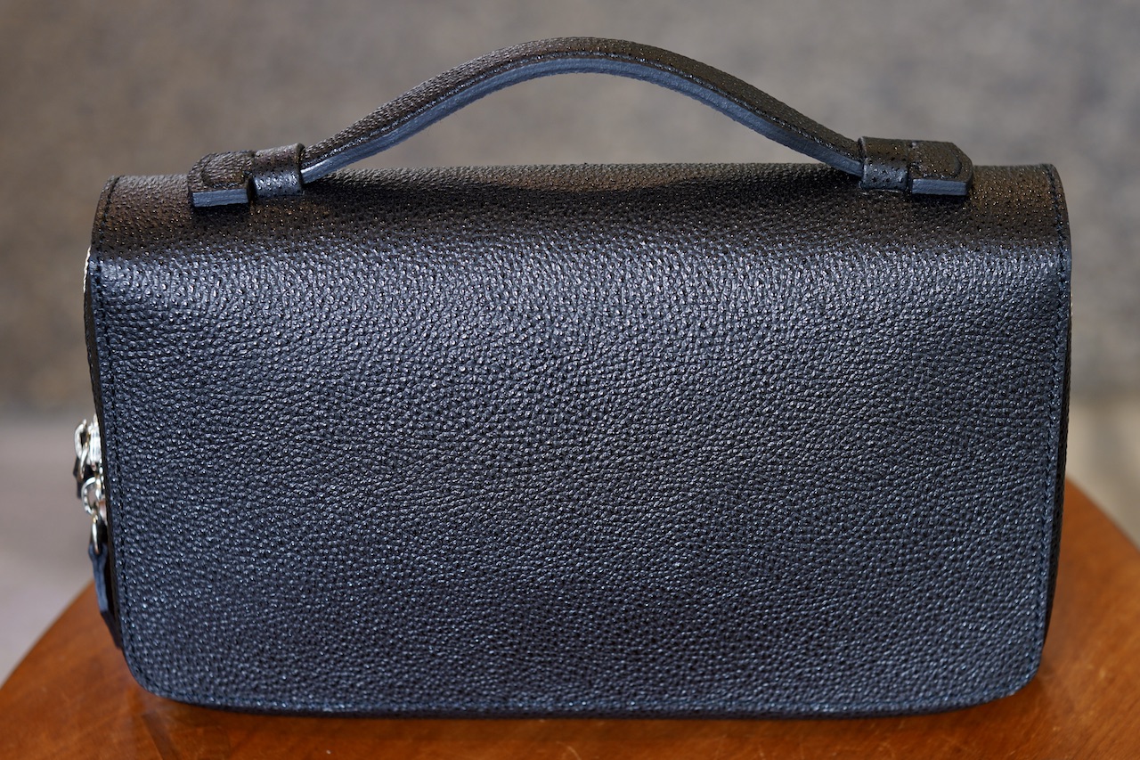 ポーチ・ピッコロは仲の良い印刷会社の社長さんに、冠婚葬祭時に違和感なく持てるセカンドバッっぐを作って欲しいとご要望があり考えたカタチ。なので色々な色革で作ってきたけれど、極端にシュランケンカーフの黒の需要が多い製品。まずはシュランケンカーフの黒を購入して、気に入って他の色も増やすというパターンが多いと思われます。税込み44,000円。