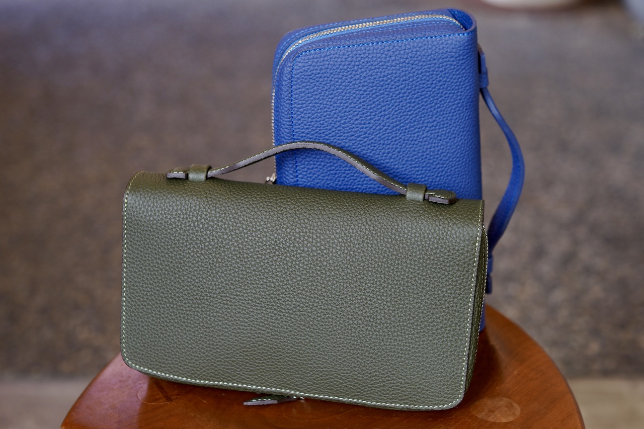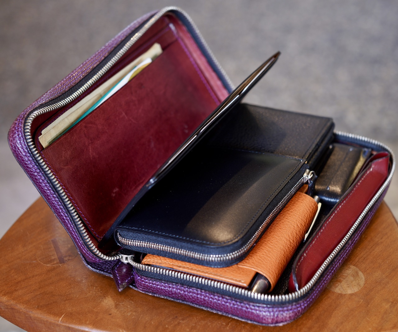 本当に小さいのに見た目からは想像出来ない収納力に、初めて購入される方はびっくりされます。これはサイズバランスと内にも外にも出っぱらない縫製方法(これを考え出すのが大変だった)と、内装を最小限のポケットにし収納力優先にした事が功を奏している。加えて内装をお財布のような仕様にしていない事で贅沢にも内装オールブッテーロ使いながら価格を抑える事に成功した。財布のように使うのであれば、財布を中に収めればいい。私はいつも上画像のように収納していて(20年使い続けているボンジョルの愛用バイオレットのピッコロ)、残心シリーズの長財布2つと名刺入れとA7手帳とミニL字ジップウォレットと釣り銭いっぱい入る小銭入れとペンケースなど。